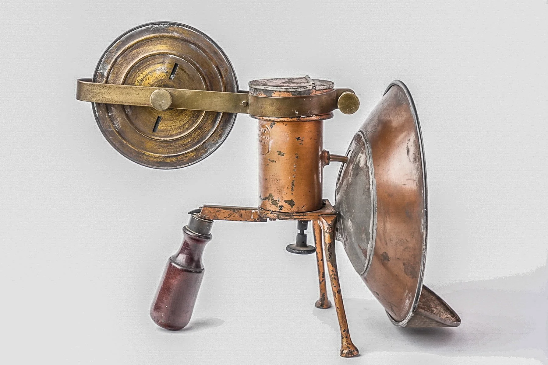 Joseph Solomon filed the patent on September 30, 1864. It appears that this rare lamp is considered the first used for artificial light photography using a Magnesium Flash. (See the Encyclopedic Directory of Photography by Henri de la Blanchère 1866 Volume VI, Page 22.) Solomon lamp consists of: a tripod support, a mobile rack reflector, and a watch mechanism protected by a housing. The latter goes back up with the help of a key. It is used to drive the magnesium tape into its tubular sheath that leads it to the reflector where it burns out. Height 21 cm.